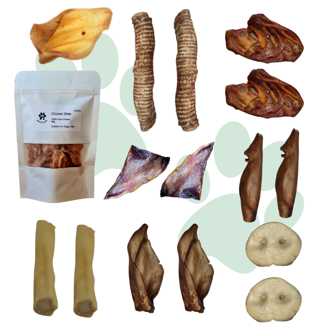 Our Mystery Treats & Chews Box offers a delicious, ever-changing selection of natural dog snacks your pup will love! Each month, surprise your dog with a fresh mix of treats and chews, carefully selected to keep things exciting and varied.